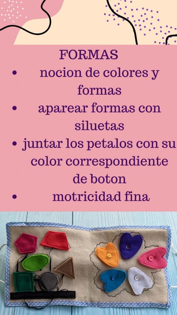 Librito pensado para trabajar colores y formas, aparear formas con siluetas y desarrollar motricidad fina al enhebrar botones.