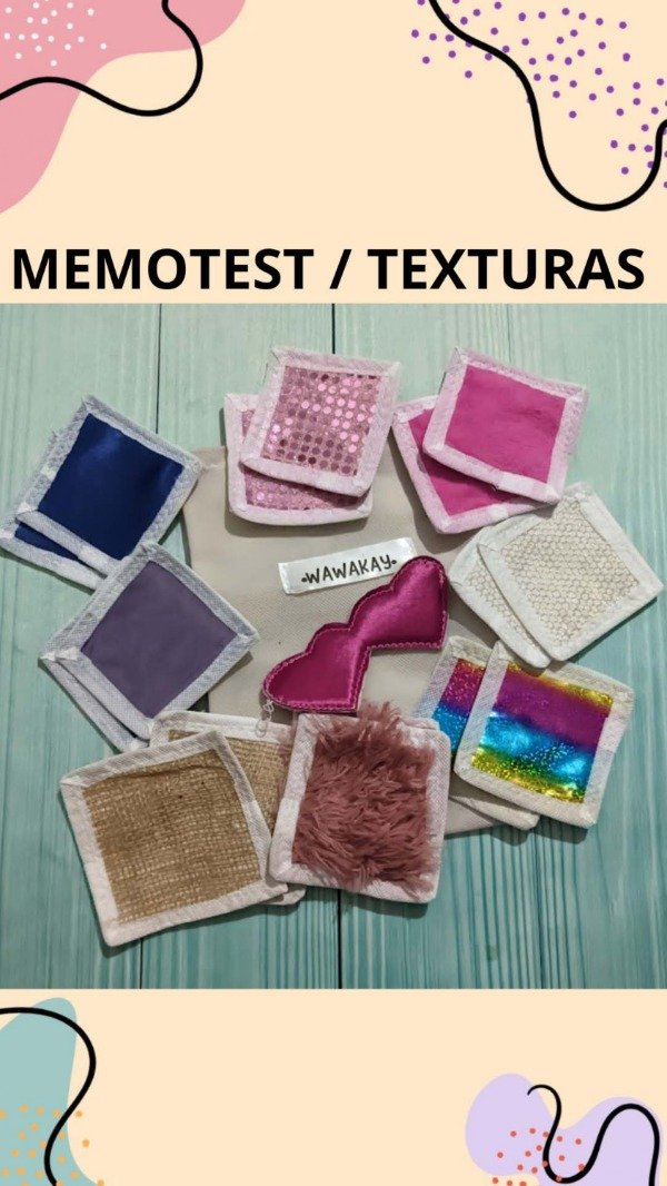 Juego de 8 pares de telas de texturas diferentes, que se pueden trabajar como juego memo test, o con los ojos cerrados, buscando la pareja de acuerdo al tacto. Vienen presentados en bolsa de friselina.